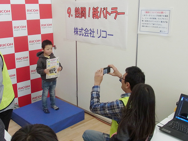 今年も会場としてお借りできたのは武道場。「コピー機になってみよう!」と「熱闘! 紙バトラー」の最強タッグが並び、今や遅し!と開場時刻を待っていました。イベント開始のゴング(?)が鳴ると、サイエンススキルに優れた子どもたちが続々とやってきては、リコースタッフに鋭い質問を浴びせます。コピー機の実験が終った後に地元テレビ局の取材を受けた男の子は、少し照れながらも体験したことの楽しさをしっかり話してくれました。