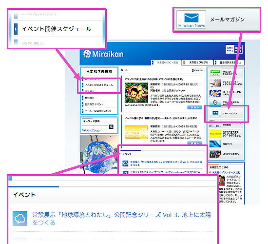 ここでは例として、キャラバン隊もたびたびお世話になっている「日本科学未来館」の公式サイトにアクセスしてみましょう。