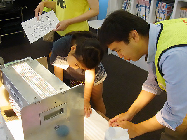 初日はお馴染みの「コピー機になってみよう!」。相変わらず集客力抜群で、小さなお子さんから高校生まで参加希望者が殺到し、すべての時間帯が満席状態で終了。その後、運営スタッフは実験機材の交換に大忙しで翌日の準備を行ないました。